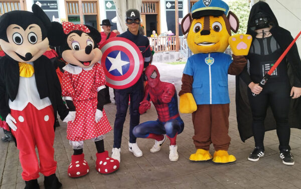 Personajes disfrazados interactivos que animan eventos infantiles, creando un ambiente lúdico y entretenido.
